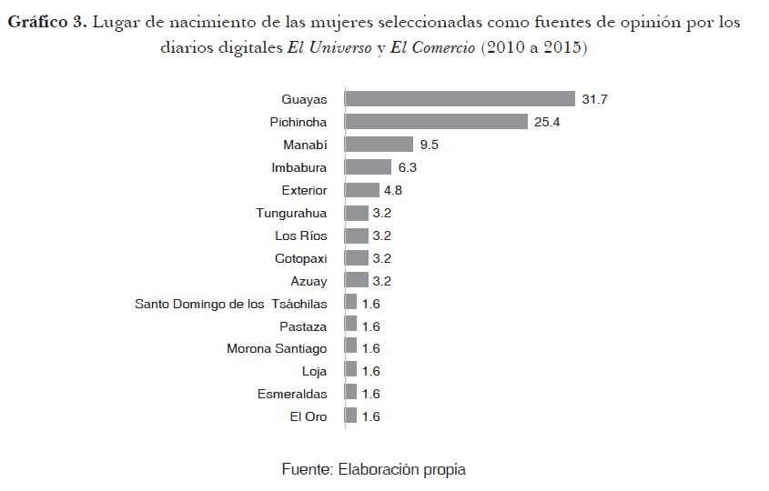 Aunque en Ecuador ha habido un avance sustancial en materia de derechos para la participación y representación femenina en la vida pública y política (Castellanos y Ulloa, 2016; Umpierrez de Reguero, Jara-Alba y Cassis Jurado, 2016), la presencia efectiva de la mujer en los medios de comunicación tradicionales y no tradicionales es aún limitada y persisten los estereotipos de género. En efecto, se coincide con la afirmación de Barba y Nieto (2006) cuando refieren que el liderazgo femenino se ha caracterizado por una marcada desigualdad frente a las condiciones masculinas en todos los ámbitos de la sociedad. De ahí que, por ejemplo, en el ranking de las 100 entidades extraídas de los medios digitales con mayor cobertura (El Universo y El Comercio), solo el 14% sean mujeres y ni siquiera se ubique una de ellas, entre las diez primeras posiciones2. En este artículo se caracteriza el perfil sociodemográfico de las mujeres más representadas por la opinión publicada ecuatoriana como fuentes de noticia, en el periodo 2010 – 2015. Esta identificación se realizó por medio de la extracción de 2.203 notas de prensa (crawling de datos) de El Universo y El Comercio, en donde se registraron 78 (17,6%) mujeres y 366 (82,4%) hombres de un total de 444 personas.