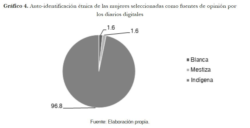 En este artículo, se constató que la auto-identificación étnica es un factor que probablemente incide significativamente en la participación de mujeres mediatizada en el espacio público. El porcentaje de mujeres que se auto-identifican indígenas o afro-ecuatorianas y que son referidas por la prensa como fuente de noticia, es mínimo en relación con las que se auto-identifican mestizas, acorde con la información proporcionada por el Censo de Vivienda y Población (INEC, 2010). Esto agrega variables nuevas al análisis tradicional de liderazgo femenino, opinión publicada y medios de comunicación digital. En este caso, los determinantes culturales son otros que por ejemplo en la mayoría de países desarrollados. Ecuador, en este sentido, aparte de ser una nueva democracia, tiene características atractivas como un porcentaje significativo de población indígena con reconocimiento constitucional (Andrade, Grijalva y Storini, 2009). Esto puede funcionar como una prueba de filtro para aquellas teorías existentes que tienen una conceptualización minimalista detrás y que muy probablemente no son tan exigentes para que su adaptación sea más amplia es decir, para que se aplique a un mayor número de casos. De este modo, examinar temas como éste en casos sui generis como Ecuador, puede resultar enriquecedor para la literatura previa por el solo hecho de agregar variables y precisar conjeturas.