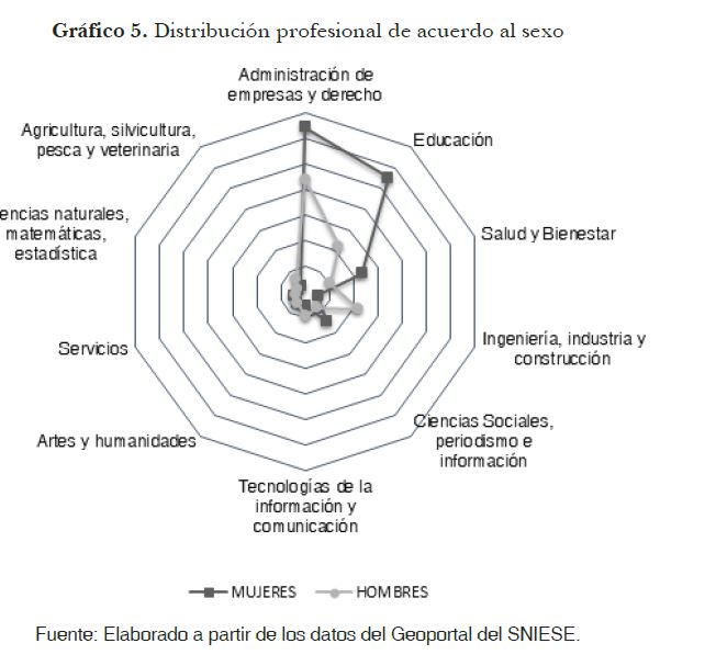 En relación a la formación profesional/ académica, predominan las profesiones de ciencias sociales en relación a las de ciencias naturales. Un informe del Instituto de la Democracia del Consejo Nacional Electoral (IDD-CNE, 2017) sostiene que el “91% de los graduados en ingenierías son hombres, aunque del total de la matrícula universitaria más de la mitad corresponde a mujeres” (p. 10). Las mujeres, según el documento del IDD-CNE, se ubican preferentemente en carreras orientadas al bienestar. En este artículo se observa que, si bien no hay un interés relevante por dichas carreras, hay un mayor porcentaje de abogadas (39,68%), y un menor porcentaje de ingenieras, químicas y estadísticas (7,94%) (ver Tabla 2). Este resultado coincide con la información estadística que presenta el organismo oficial Sistema Nacional de Información de la Educación Superior del Ecuador (SNIESE) en su Geoportal, que ofrece información estadística de las profesiones segmentadas por sexo (ver Gráfico 5). Así, a partir de esta información, se pudo corroborar que las carreras de Derecho, Periodismo e Información, Economía y Ciencias de la Educación, son las áreas de formación académica/ profesional que las mujeres ecuatorianas más optan.