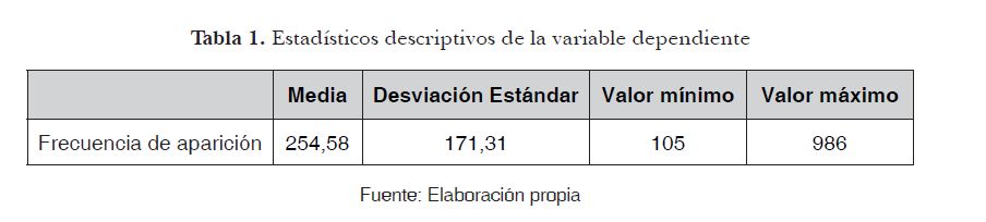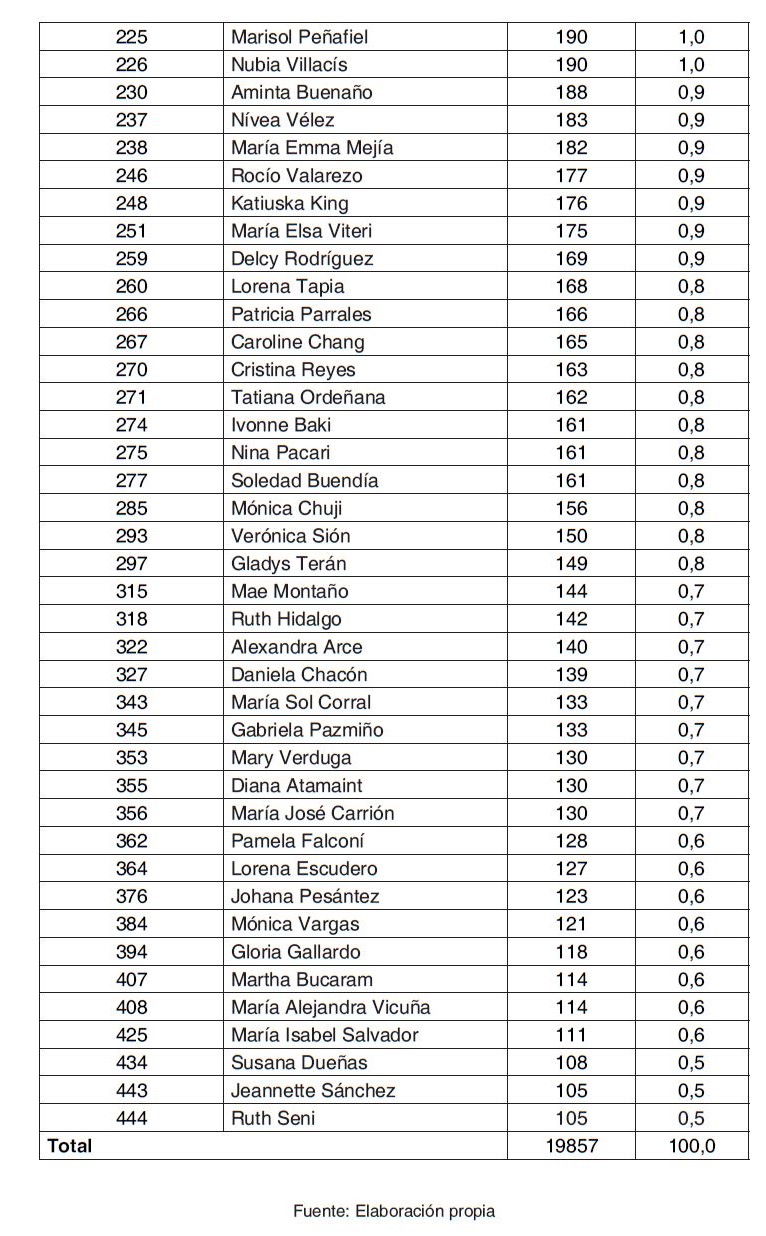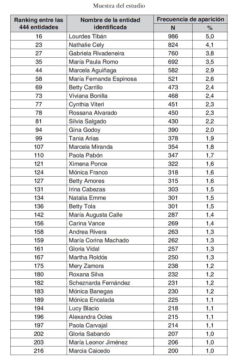 La Tabla 1 indica que la media de la frecuencia de aparición es de 255 referencias, de forma agregada en El Universo y en El Comercio. No obstante, la dispersión de respuesta es relevante según se puede observar en el resultado de la desviación estándar. En este sentido, las respuestas oscilan entre 105 y 986 apariciones. En efecto, la entidad que ocupó el valor máximo de la muestra es Lourdes Tibán (ex Asambleísta Nacional y lideresa indígena); en cambio, Ruth Seni (Presidenta de la Corte Constitucional) y Jeannette Sánchez (ex Ministra de Bienestar Social y Ministra Coordinadora de Política Económica), se posicionaron en las últimas posiciones del ranking total extraído del crawling de datos (es decir, 443 y 444, respectivamente).