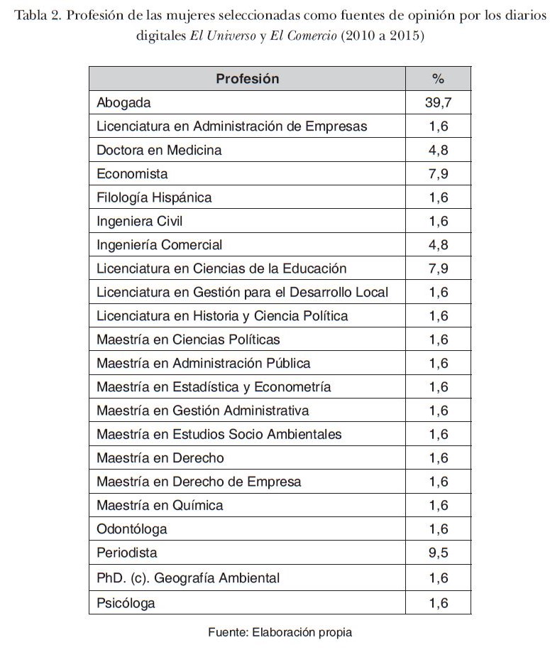 En Ecuador, los resultados oficiales de los últimos comicios presidenciales celebrados en febrero de 2017 evidenciaron un porcentaje significativo de mujeres en el ámbito legislativo. Por tercera vez en la historia política ecuatoriana, la representación femenina en la Asamblea Nacional fluctuó entre el 35% al 40% del total de curules (Consejo Nacional Electoral, 2017). Sin embargo, en Ecuador todavía existen claras desventajas de las mujeres frente a los hombres en temas como: la equidad en la remuneración, los horarios de trabajo, las actividades que desempeñan, entre otros factores (Gender Gap Report, 2016; El Comercio, 9 de marzo de 2018). Con estos antecedentes y tomando en consideración que la población femenina ecuatoriana constituye el 50,4% (INEC, 2010), resulta interesante caracterizar a las mujeres representadas por la opinión publicada; es decir, si los medios están tomando como referencia sus opiniones, y qué perfil proyectan de ellas.