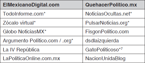 Además de sitios y cuentas como: ElMexicanoDigital.com, TodoInforme. com, Zócalo virtual, Globo NoticiasMX, La IV República, LaPolíticaOnline.com. mx, QuehacerPolítico.mx, NoticiasOcultas. net, PulsarNoticias.org, FisgonPolitico. com, dsdlaizquierda, GatoPoliticoso o NacionUnidaBlog.