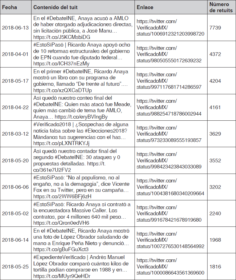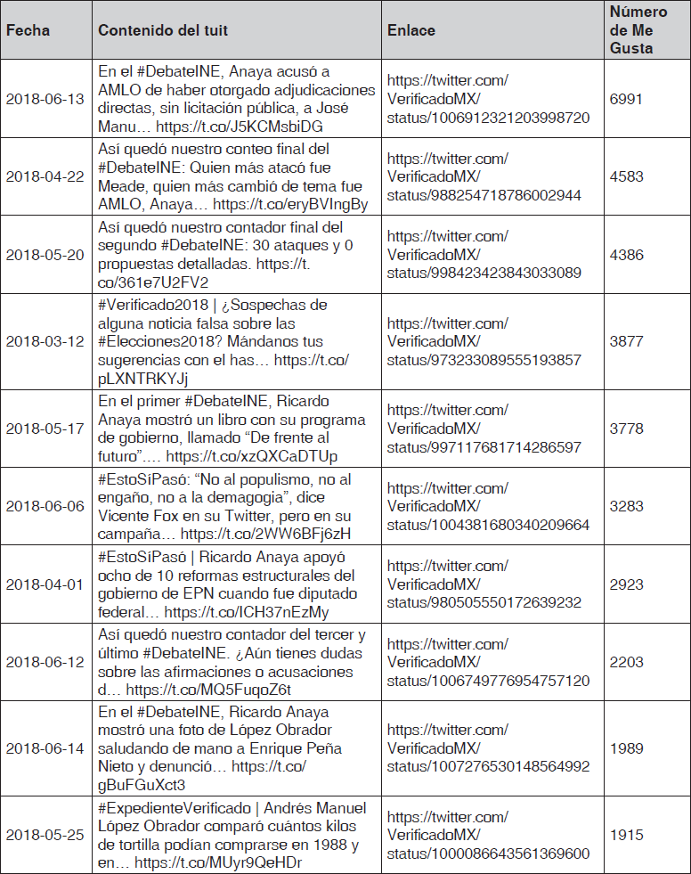 Entre el 12 de marzo de 2018 y el 2 de julio de 2018 fecha en que se conocieron los primeros resultados se publicaron 3116 tuits desde la cuenta de VerificadoMX, incluidos retuits y menciones.