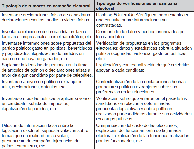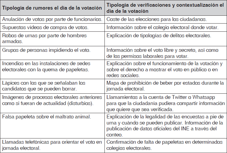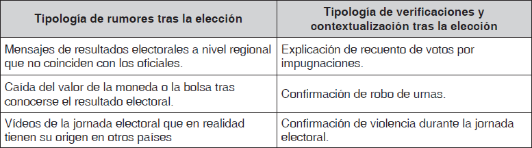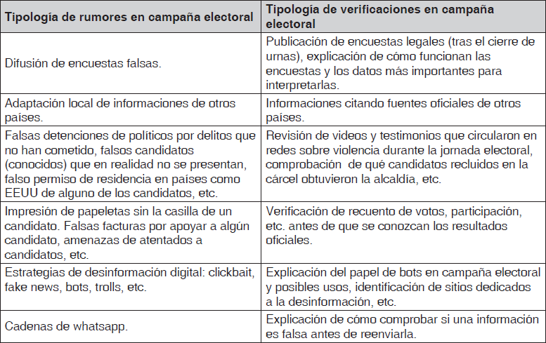 De nuestra investigación, resulta pertinente señalar que a medida que se aproximaba la fecha de elección la intensidad y el tipo de rumores que circularon y se compartieron variaron. Destacan los relacionados con la información sobre el desarrollo de la campaña electoral: difusión de encuestas falsas, estrategias de desinformación digital como cadenas de whatsapp, clickbait, fake news, bots, etc. Por otra parte, las verificaciones publicadas el día de la votación – principalmente de contextualización de las informaciones que circulaban-estaban relacionadas con el derecho a voto, su funcionamiento, limitaciones y recomendaciones.