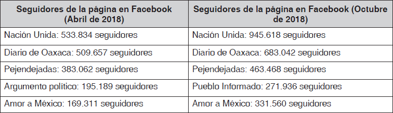 Al mes de su lanzamiento, VerificadoMX 2018 emitió un informe con los sitios más importantes en la publicación de noticias falsas, señalando que comparten algunas características: no citan fuentes, están construidas en plataformas de blogs con una misma estructura, no tienen una sección de contacto o de información sobre quién dirige el portal, utilizan mayúsculas y símbolos de exclamación en los títulos, así como adjetivos calificativos en artículos que suelen estar editorializados y a menudo no llevan la firma de su autor (López et alt, 2018). Entre esas páginas de Facebook destacaban: Nación Unida, Diario de Oaxaca, Pejendejadas, Argumento político y Amor a México.