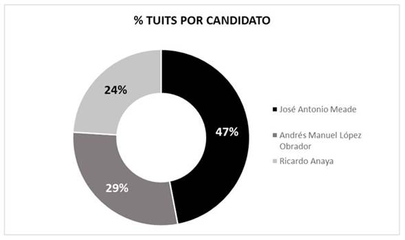 La figura 1 muestra que el 47% de los tuits emitidos por los usuarios hablaron sobre el candidato José Antonio Meade, teniendo la mayor presencia en los mensajes analizados.