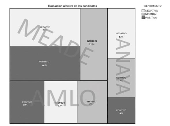 En la figura 2 se observa la presencia mayoritaria de las comunidades digitales que expusieron sus opiniones en contra de los candidatos y/o sus campañas a través de tuits con sentimiento negativo (47%), José Antonio Meade obtuvo el mayor porcentaje negativo (20%), seguido de Ricardo Anaya (13%) y Andrés Manuel López Obrador (12%). Con respecto a los tuits de apoyo, Meade tuvo el 16% de tuits positivos.