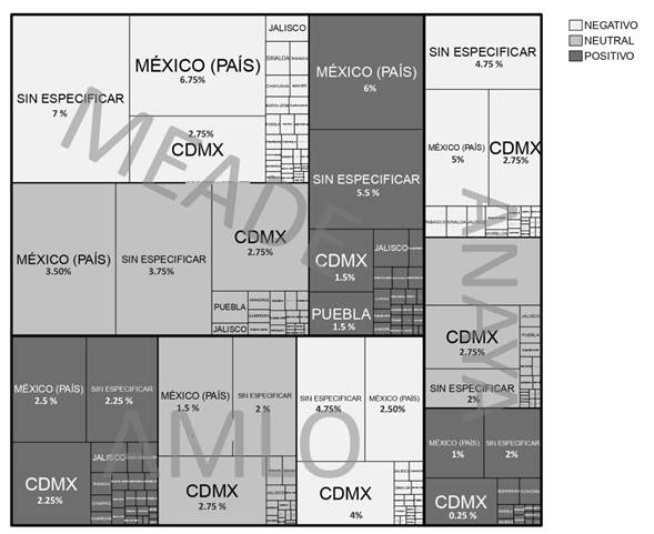 La figura 3 muestra las interacciones de los usuarios de Twitter sobre las campañas y sus candidatos, destacaron de la comunidad de usuarios provenientes de la Ciudad de México donde se emitió el 21.25% de los tuits y quienes reflejaron su negativa hacia Andrés Manuel López Obrador con un 4%. También se observa la participación de los estados de Jalisco (2.50%) y Puebla (2.25%) siendo Andrés Manuel (1.5%) y Meade (1.5%) respectivamente, los candidatos apoyados. Se reflejó una mínima participación dentro de la categoría “otros estados” (7%) conformada por nueve estados con menos del 1%. La localización denominada “México” (país) corresponde a los tuits sin identificar su lugar de procedencia.