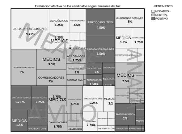 Como se muestra en la figura 4, los usuariosde Twitter catalogados como “ciudadanos comunes” (31%) fueron la comunidad digital con más tuits emitidos sobre las Elecciones 2018 y quienes más tuitearon en negativo sobre los tres candidatos, de los cuáles José Antonio Meade obtuvo el mayor porcentaje (9.25%). Los “periodistas” reflejan un comportamiento similar a los “ciudadanos comu nes”, mientras que los “medios de comunicación” mantienen su lado neutral; en conjunto reúnen el 40% del total de los tuits emitidos sobre las campañas políticas en Twitter. El apoyo hacia los candidatos provino de las cuentas de sus “partidos políticos”.
