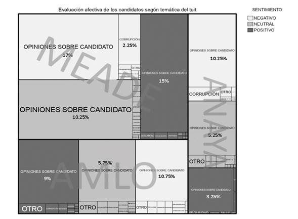 Respecto a los asuntos que se trataron en los tuits, en la figura 5 se observa que la comunidad digi tal interactuó en su mayoría sobre la personalidad de los candidatos y/o su campaña (87%), donde predomina el sentimiento negativo en los tres candidatos. Del total de tuits, el 13% trataron sobre políticas públicas de las cuales el 5% destaca el asunto de la “Corrupción; en ese tema se presenta ron más negativos respecto a José Antonio Meade (2.25%). Quien resulta con menos negativos en el mismo tema es Andrés Manuel López Obrador (0.50%).