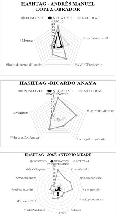 La figura 6 presenta tres gráficos que muestran los hashtags utilizados por los usuarios al emitir sus textos hacia uno de los candidatos. En los tuits que mencionaron a Andrés Manuel López Obrador predominaron los hashtags positivos como #AMLO o #JuntosHaremosHistoria, sin embargo, también fueron ocupados en tuits con carga negativa y neutra. Por su parte, los tuits sobre Ricardo Anaya se complementaron en su mayoría con hashtags positivos como #DeFren teAlFuturo y #MujeresConAnaya. Los tuits que mencionaron al candidato José Antonio Meade emplearon un mayor número de hashtags para favorecerlo, siendo #MeadePresidente el más apoyado.