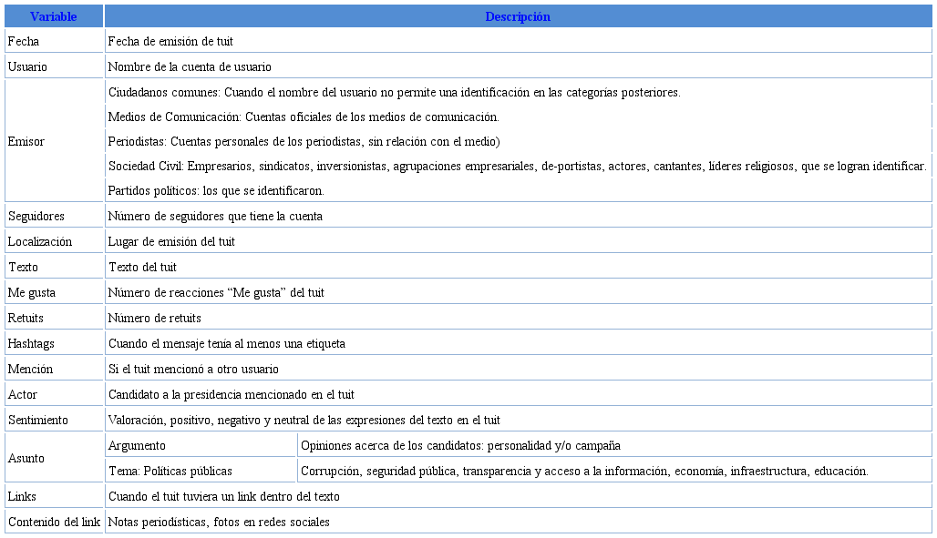 Se construyó una base de datos que analizó, mención por mención, el sentido de la interacción acer ca del candidato. Dicho corpus se compone de las variables que se presentan en la tabla 1.