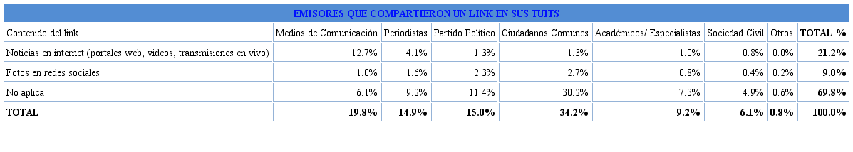 En la tabla 2 se pueden ver los recursos multimedia del link que compartieron los emisores, donde el 30.2% de los tuits recurrieron a un link en el cuerpo de sus mensajes como complemento a sus textos. En cuanto a las notas compartidas desde un portal web, vemos que sólo el 21.2% de los tuits analizados se apoyaron en este tipo de información. Los que más recurrieron a ellas son los propios medios de comunicación (12.7%) y los que menos la sociedad civil (0.8%), académicos o especialistas (1%) y los ciudadanos comunes (1.3%). El 69.8% de la comunidad digital no vincula la información de otros medios en sus tuits, sino que sólo expresan sus sentimientos sobre las cam pañas y sus candidatos.