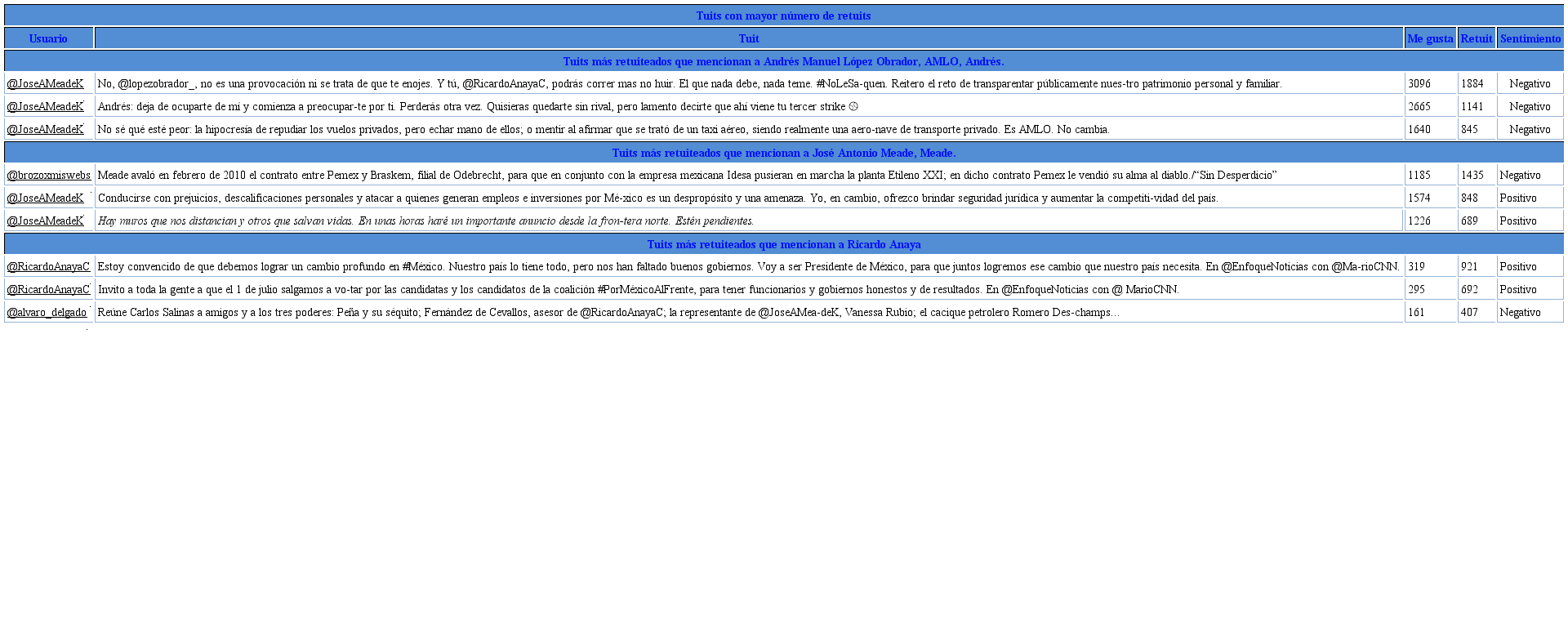En la tabla 3 se presentan los tuits con más likes y más retuits, fueron los que emitió José Antonio Meade de la coalición PRI-Verde-Nueva Alianza contra AMLO de Morena. De los que tratan sobre José Antonio Meade, el más retuiteado tiene tendencia negativa y lo emite un periodista. Los que son emitidos por los propios candidatos tienen tendencia positiva, y los de los periodistas son negativos hacia el candidato que mencionan.