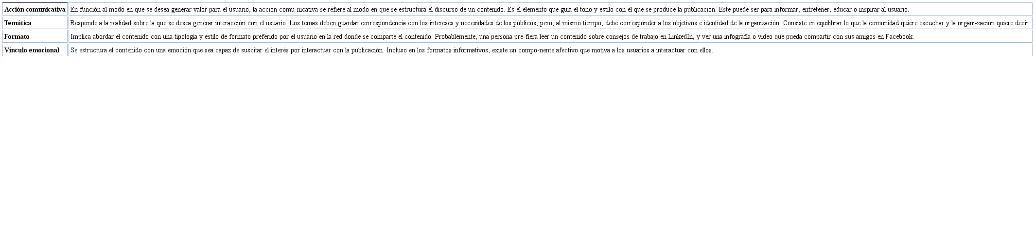 Coto y Borowiecka (2014) señalan cuatro elementos claves en el éxito de la comunicación social media: el contenido, el lenguaje, el auditorio y el motivo. El contenido responde a la realidad sobre la que se desea generar una conversación. El nivel de interacción sobre el contenido compartido de penderá de lo atractivo, útil e interesante que resulte para una determinada comunidad. El lenguaje hace referencia a los tonos y estilos de la comunicación, y deben corresponderse con la personalidad de la organización y las características de la comunidad. El auditorio consiste en tener en cuenta los intereses y preferencias de los públicos con los que se desea conectar para incentivar su interacción con los contenidos. El motivo responde a la razón por la cual buscamos la participación de la comu nidad sobre el contenido compartido. Definir cuáles son los objetivos que se desean alcanzar con el contenido que se comparte, responde a una estrategia de la comunicación para establecer, fortalecer y mantener relaciones con las comunidades que aportarán valor a la organización.
