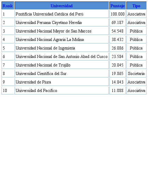 Para la presente investigación, se ha seleccionado el ranking elaborado por la Sunedu debido a que con sidera indicadores de producción científica, los mismos que se toman como referencia del capital inte lectual con el que cuentan las universidades peruanas, como sus profesores, investigaciones publicadas, proyectos de investigación. En los 10 primeros lugares del ranking presentado en el primer Informe bie nal elaborado por la Sunedu en el 2018 figuran cinco universidades públicas, cuatro privadas asociativas y una universidad societaria. A continuación, se presenta la tabla 2 con el listado de las universidades.