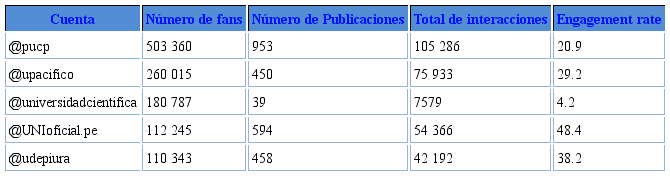 Con el objetivo de garantizar que el estudio aborde cuentas auténticas y gestionadas por la institu ción, se han seleccionado aquellas universidades que, estando en el top 10 del ranking de Sunedu, tengan la insignia de validación de la plataforma. Dentro del top 10 del ranking Sunedu, las univer sidades con una cuenta en Facebook verificada son la Universidad Católica del Perú, la Universidad del Pacífico, la Universidad Científica del Sur, la Universidad Nacional de Ingeniería y la Univer sidad de Piura.