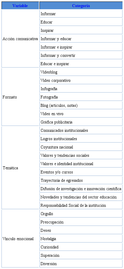 Las variables responden a los elementos comunicativos, que son los componentes con los que se desarrollan las publicaciones para alcanzar los objetivos deseados. En el marco teórico del estudio, se han presentado los elementos comunicativos presentes en las publicaciones direccionadas a ges tionar una marca universitaria en redes sociales a través de los lineamientos del branded content: acción comunicativa, formato del contenido, temática abordada y el vínculo emotivo. Así, se des tacan los elementos que han generado mayor interacción. La finalidad es determinar los elementos que significan mayor valor para los usuarios. Las categorías se proponen después de haber realizado una primera aproximación al 20% de la muestra seleccionada. Tras verificar de qué modo se hacía visible y cuantificable el elemento comunicativo (expresado en la variable) se determinaron las categorías que integran la ficha de análisis de contenido.