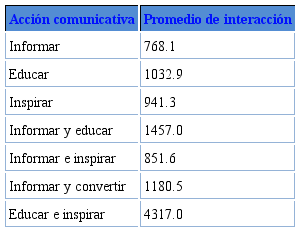 Como se muestra a continuación, en la tabla 5, las publicaciones categorizadas con la acción comu nicativa “informar” alcanzaron en promedio 768.1 interacciones, el nivel más bajo. Mientras que las publicaciones consideradas en la categoría “educar e inspirar” alcanzaron un nivel mayor de respuesta, obteniendo hasta 4317 interacciones por publicación.