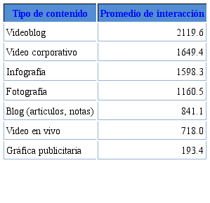 Con respecto al elemento comunicativo referido a los formatos, se puede apreciar en la tabla 6 que el videoblog, de todos los formatos, fue el que mayor nivel de interacción en promedio alcanzó, con 2119.6 interacciones en promedio. El video corporativo fue el formato audiovisual que alcanzó, en segundo lugar, un mejor nivel de interacción. La infografía es el tercer formato con mayor nivel de interacción en promedio, con 1598.3 interacciones. En el caso de los videos en vivo o streaming, cabe resaltar que el nivel promedio de interacción alcanzado fue mayor que el de la gráfica publi citaria, que fue el más bajo de todos. Un ejemplo de video en vivo es el contenido llamado “Mesa UP”, un programa en vivo que propicia una participación directa y en tiempo real de los usuarios durante la transmisión de un debate en el que profesores y colaboradores de la universidad discuten sobre un tema de interés público.
