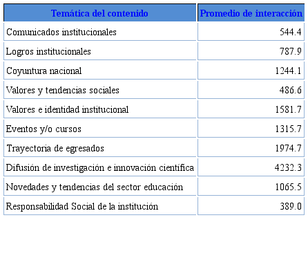 En la medición realizada sobre los temas de mayor relevancia para los usuarios se encuentran, en primer lugar, aquellos contenidos sobre difusión de investigación y proyectos de innovación reali zados por la institución, alcanzando 4232 interacciones en promedio por publicación. Por otro lado, dentro de las temáticas abordadas con nivel de interacción alto, destacan también las publicaciones relacionados con la trayectoria de egresados, los eventos institucionales, como ceremonias de gra duaciones, y aquellas publicaciones para comunicar los valores e identidad de la institución. Con respecto a los contenidos que abordan temáticas relacionadas a la coyuntura nacional, y al sector de educación, la tabla 7 muestra que los usuarios participan con un nivel de interacción medio alto de los contenidos relacionados con su entorno.