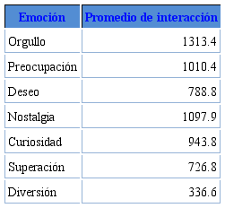 Los resultados de la tabla 8 muestran que las publicaciones vinculadas al orgullo institucional tie nen una interacción muy elevada. Como señaló un estudio realizado por Peruta y Helm (2018), las universidades cuentan en sus cuentas oficiales con seguidores muy vinculados emocionalmente a sus noticias de investigación, triunfos deportivos y logros universitarios. Por otro lado, si bien los resultados muestran un nivel de interacción muy parejo entre los tipos de vínculos emocionales gestionados, destaca también la preocupación, especialmente, cuando es gestionada en función a los problemas del entorno de los usuarios.