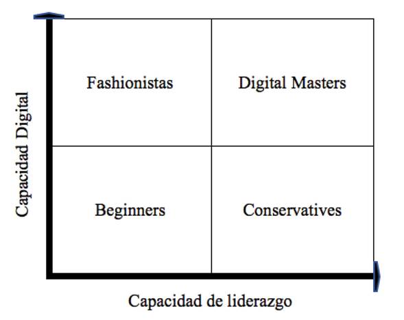 De acuerdo con este modelo, las empresas pueden tener cuatro posibles niveles de madurez digital: alta intensidad digital y gestión de la transformación, baja intensidad digital de gestión de la trans formación, o una mezcla de alta y baja para las dos dimensiones: