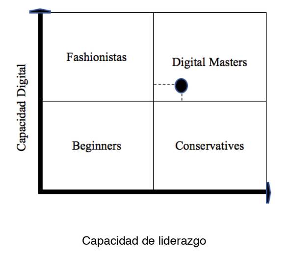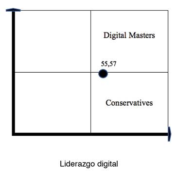 El liderazgo digital de las empresas españolas participantes se sitúa a la derecha de la matriz entre los denominados conservatives y los digital masters, según ha quedado expuesto en la Figura 2.