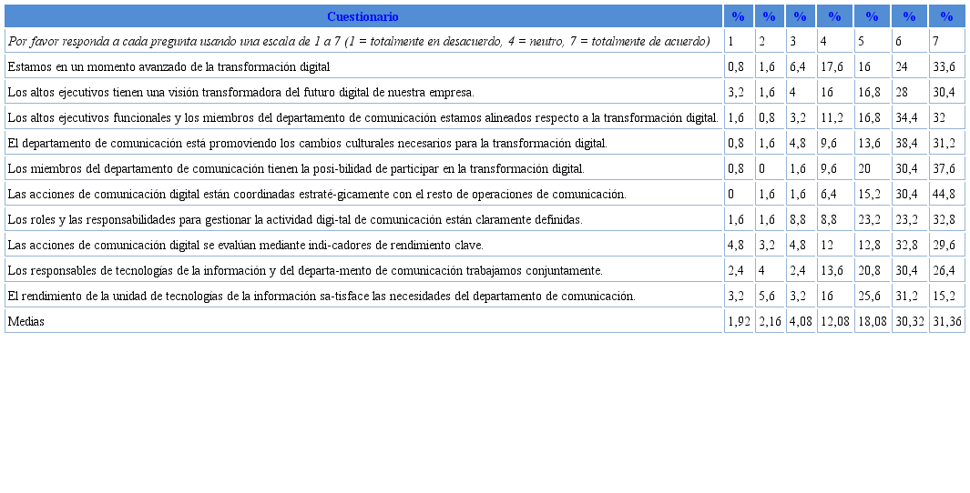 Como se ha indicado, la transformación digital requiere de un fuerte liderazgo para impulsar el cambio. Y, ciertamente, se observa que los departamentos de relaciones públicas y comunicación de las compañías españolas participantes en el estudio se muestran capaces ante este reto digital e indican, incluso, estar en un momento bastante avanzado de su transformación digital. Una realidad sensiblemente congruente con los optimistas resultados de los diversos informes consultados.
