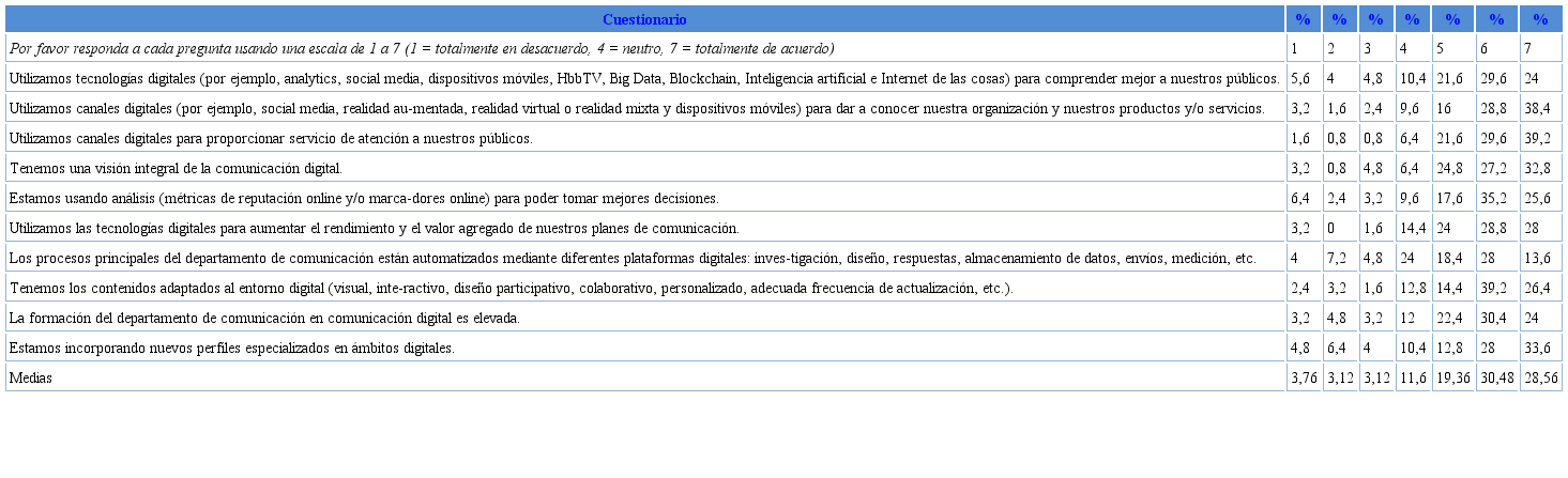 De hecho, el cambio tecnológico seguirá aumentando, por lo que el aprendizaje de nuevas habilida des será una necesidad constante durante toda la vida profesional de los comunicadores (Sánchez, 2019). Sin embargo, el departamento de relaciones públicas y comunicación de la muestra de análi sis de esta investigación se presenta con conocimiento, destreza y experiencia digital. El estudio de Roland Berges (2018) coincide y refuerza esta conclusión de nuestra investigación, pero también apunta que todavía existe un cierto recelo respecto a usos más avanzados, que únicamente son apro vechados por unas pocas empresas innovadoras. En este aspecto las organizaciones participantes se situarían muy cerca de la categorización de conservatives, es decir, de aquellas que no arriesgan en la implementación digital porque no están dispuestas a invertir los recursos económicos necesarios que ello conlleva.