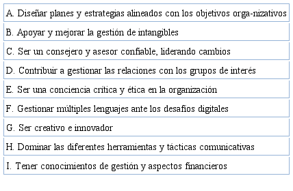 Como se aprecia en los hallazgos, las capacidades que han aportado los expertos en ambos países han coincidido en subrayar la dimensión de asesoramiento, estrategia y planificación, la gestión de relaciones con múltiples públicos y la opción de ser una conciencia crítica en la organización y asegurar comportamientos éticos y de inclusión social. En otro ángulo, también en España y Argen tina los expertos han coincidido en señalar la importancia de los desafíos digitales y de múltiples plataformas y de la generación de contenidos.