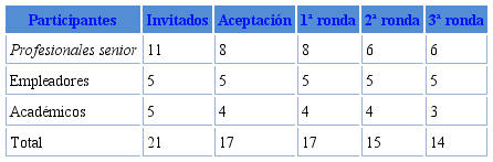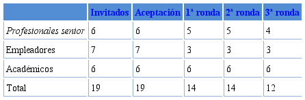 En el proceso de selección del panel de expertos, a fin de conseguir una cantidad pertinente, se in vitó a participar a 19 personas, seis profesionales, seis académicos y siete empleadores.