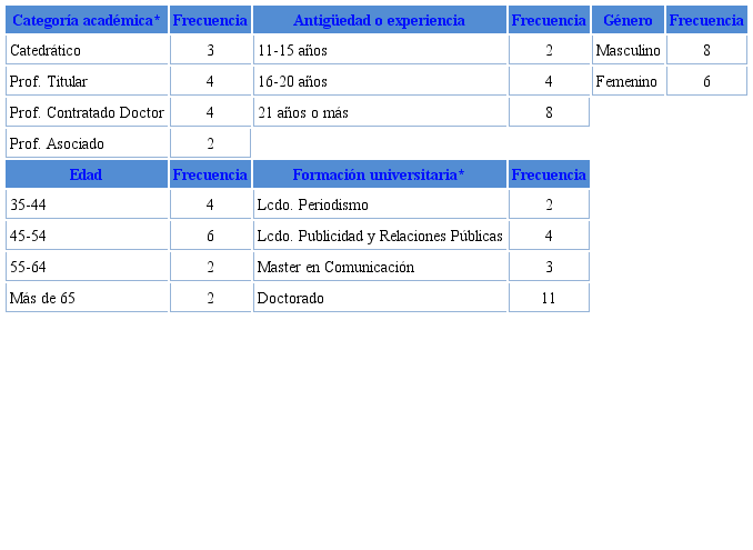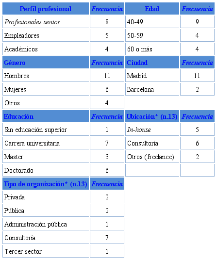 La selección de la muestra del panel Delphi y los grupos focales ha tenido en cuenta tres criterios: académicos con amplia experiencia docente e investigadora, y profesionales con responsabilidades en equipos y contratación. Como se observa en las tablas, se ha buscado intencionalmente una representatividad mayor de los profesionales, al ser un proyecto centrado en la reflexión sobre el potencial de la profesión.