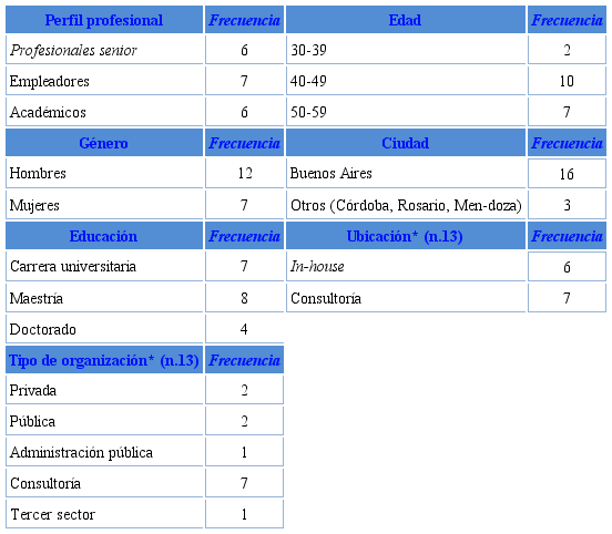 Como se evidencia en las tablas, la representatividad otorgada a cada uno fue similar, aunque vale consignar que en el caso de los empleadores su condición podía solaparse con la de los profesio nales, al ser casi todos los máximos responsables de sus consultoras. De este modo, se adecuó la muestra a la intención del proyecto, es decir, centrar su interés en la reflexión sobre el potencial de la profesión.
