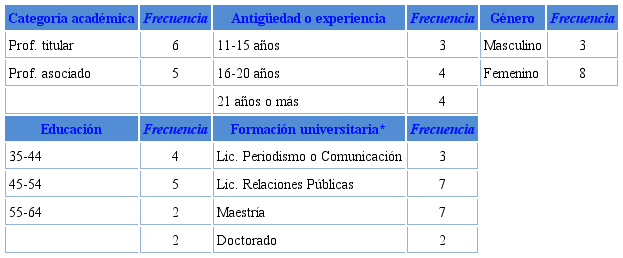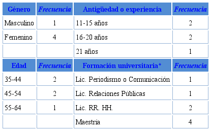 Los criterios de selección para los académicos fueron: a) directores o coordinadores de carreras de universidades validadas por el CPRPRA, b) docentes con experiencia en investigación, c) docen tes con participación en debates sobre la profesión y sus tendencias. Los profesionales senior, en tanto, debían ser: a) miembros del CPRPRA, en cualquier sector de actividad, b) interesados en la participación en debates, o autores de materiales sobre la evolución profesional. Finalmente, los empleadores debían: a) ser reconocidos como líderes en sus ámbitos, b) evidenciar su interés por las comunicaciones, habiendo participado en conferencias, c) ser los responsables finales de reclutar personas para equipos de 20 o más integrantes. En todos los casos, los panelistas no necesitaron cumplir todos los criterios para cada perfil y, además, se trató de abarcar un grupo de personas geo gráfica, sectorial y etariamente diversas, del mismo modo que en materia de género, aunque, como se ha mencionado, sin la intención de ser representativo de la profesión. Los perfiles detallados del panel para las tres rondas se muestran en las tablas 5 y 6.