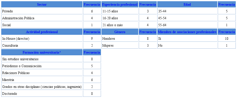 Para los grupos focales, se seleccionó la muestra con idénticos criterios que en el panel Delphi. Un total de 54 personas (14 académicos y 40 profesionales) participaron en siete grupos de discusión organizados en cuatro ciudades españolas (Madrid, Barcelona, Valladolid, y Valencia), a fin de asegurar la representatividad de sectores, organizaciones y tamaños. En las tablas 3 y 4 se detalla la muestra. La formación universitaria es una pregunta con respuesta múltiple.