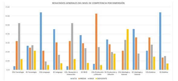 Por tratarse de un proceso evaluativo del nivel de competencia, la escala de valoración Alta, Me dia, Baja y Deficiente se caracteriza por los siguientes descriptores: quien obtiene una calificación ALTA, demuestra un desempeño con fortalezas en la mayoría de los indicadores que estructuran este nivel, pero no están excentos de mejoramiento. Para aquellos cuya calificación es MEDIA, el desempeño es básico y existe oportunidad de mejora en el 50% de los indicadores de la competen cia mediática. El nivel BAJO de competencia necesita refuerzo en la alfabetización mediática para fortalecer más del 50% de los indicadores de la competencia mediática y la DEFICIENTE el nivel de competencia es bajo en casi todos los indicadores y la formación para lograr un desempeño más eficaz en la interacción mediática debe ser más exhaustiva.