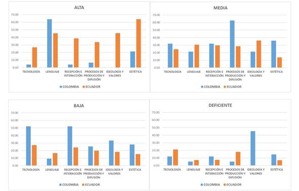 Ecuador tiene la competencia de Ideología en más de 40% en nivel alto y en casi 40% en nivel medio. Y la competencia de Recepción en casi 40% en nivel alto y 30% en nivel medio. Mientras Colombia tiene la competencia de Ideología, en más de 85% en niveles bajo y deficiente. Y pasa lo mismo con la dimensión de Recepción. Más de 60% en niveles bajo y deficiente, esto quiere decir que un grueso número de periodistas de ambos países evidencia dificultades en el momento de con sumir medios, como cualquier ciudadano común, a pesar de su formación profesional. Entre ellos, hay falencias a la hora de seleccionar con criterios conscientes y razonables su propia dieta mediáti ca; les falta capacidad para dilucidar porque prefieren unos medios de otros o como sus emociones entran a interactuar con los consumos mediáticos que realizan; igualmente, quien tiene media o baja competencia mediática en la dimensión Recepción e Interacción enfrentará dificultades al interac tuar con los medios para apoyar una construcción de ciudadanía que transforme el entorno social desde este ecosistema de múltiples pantallas. Igualmente, a los periodistas les falta solvencia en el momento de producir medios que aprovechen las innovaciones tecnológicas para promocionar valores que contribuyan a la mejora del entorno, desde una actitud de compromiso social y cultural.