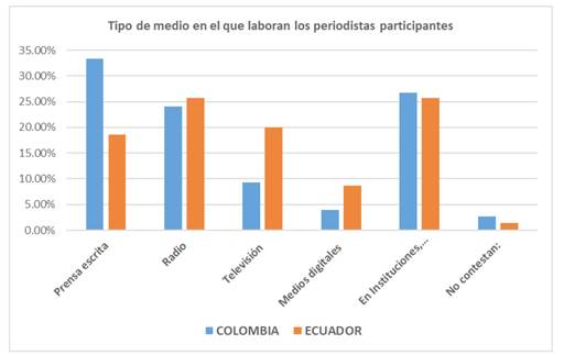 En Colombia se encuestaron 75 periodistas, 58.70% hombres y 38.60% mujeres (2,7% no respon dió esta pregunta) y en Ecuador 71, 79.10% mujeres y 20.90% hombres. Esta muetra fue elegida por criterios específicos que le dieron heterogeneidad: en ambos países se trabajó con profesionales de diferentes medios de comunicación, públicos y privados; en Colombia participaron periodistas que habían integrado a su quehacer la relación comunicación-educación-medios y en Ecuador, por ejemplo, se incluyeron, periodistas de medios incautados por el Estado desde el 2008 para resarcir daños a la economía nacional por parte de sus dueños, grupo bancario que quebró en los años 90.