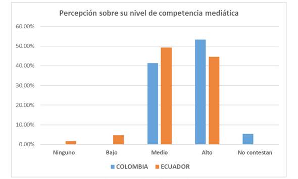 El 38.6% de las periodistas colombianas y el 79.1% de las ecuatorianas; más el 58.7% de los perio distas colombianos y el 20.9% de los ecuatorianos que fueron parte de este estudio respondieron, en las preguntas iniciales, antes de las de valoración, que su nivel de competencia mediática estaba entre los niveles alto y medio. Como se puede apreciar en el Gráfico 4, el mínimo de ellos se ubicó en los niveles de baja o ninguna competencia. Además, quienes obtuvieron más bajas valoraciones, los colombianos, fueron los de mayor frecuencia en el nivel de alta competencia.