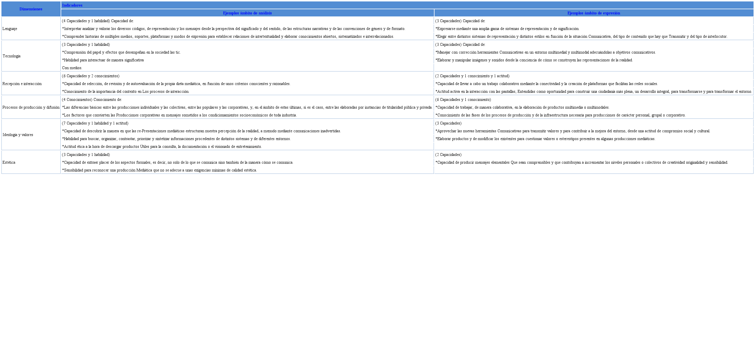 El término dimensiones, centra la atención en entender que desarrollar la competencia mediática requiere del perfeccionamiento de diferentes esferas con sus respectivos indicadores y ámbitos. Al respecto, el desarrollo de las investigaciones que nutren este artículo se basaron en la propues ta de dimensiones e indicadores de competencia mediática de Joan Ferrés y Alejandro Piscitelli (2012).