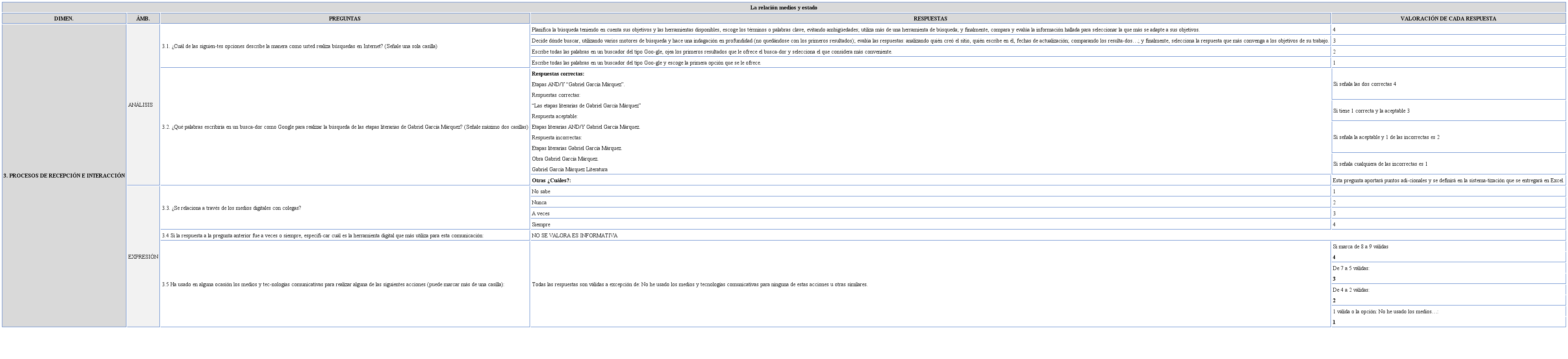 Para al análisis de datos, tanto en Colombia como en Ecuador, se estableció una escala valorativa que determinó las preguntas a calificar dentro del cuestionario y que igualó en peso cada una de las dimen siones (16.66%) de la competencia mediática. En Colombia esta valoración del nivel de competencia se hizo por dimensiones desde los siguientes rangos valorativos: competencia alta (80%-100%), ca lificación 4.0-5.0; competencia media (60%-79%) calificación 3.0-3.9; competencia baja (40%-59%) calificación 2.0-2.9; competencia deficiente (0%-39%) calificación 0-1.9. En el caso ecuatoriano la valoración de competencias se hizo por pregunta y por dimensión según una escala de cero a 4 en la cual cero corresponde a la competencia deficiente, dos a la baja, tres a la mediana y 4 a la alta; pero los resultados conjuntos que presenta este artículo se ocupan de los datos generales arrojados por las dimensiones. A continuación se presenta, a modo de ejemplo, un apartado de la tabla de valoración: