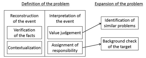 The findings show that this perspective is also applicable to Enjō phenomena, which means that Enjō participants actually communicate with each other to define the problem. This is theoretically reasonable considering that, in informal societal reactions, such as Enjō, where there are no distinct rules, com munication among the participants is more likely to be active than in formal societal reactions because people are required to create an improvised definition of the problem on the spot. As shown in the cases analyzed, once a statement that insists on the existence of a problem begins to catch public attention on Twitter, users start discussing or ascertaining whether it is a problem or not by posting their own opinions or information related to the agenda. Through the analysis of the data, this study generated two categories of communication, namely ‘reconstruction of the event’ and ‘interpretation of the event.’ These catego ries constitute the interaction processes through which the problem is defined.
