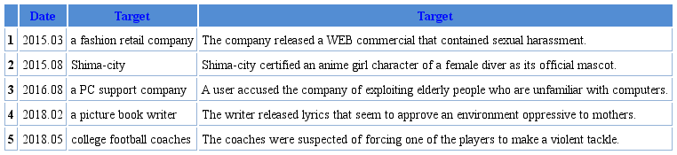 The collected data are posted tweets in each Enjō case. Though Enjō can occur anywhere on the Internet and we can collect comments from various online platforms such as blogs or online bulletin boards, it is desirable to focus on a specific platform in order to make the conditions of the compared cases uniform. This study chooses Twitter as the research field since Twitter has been the main arena for Enjō phenomena in recent years (NHK, 2017).