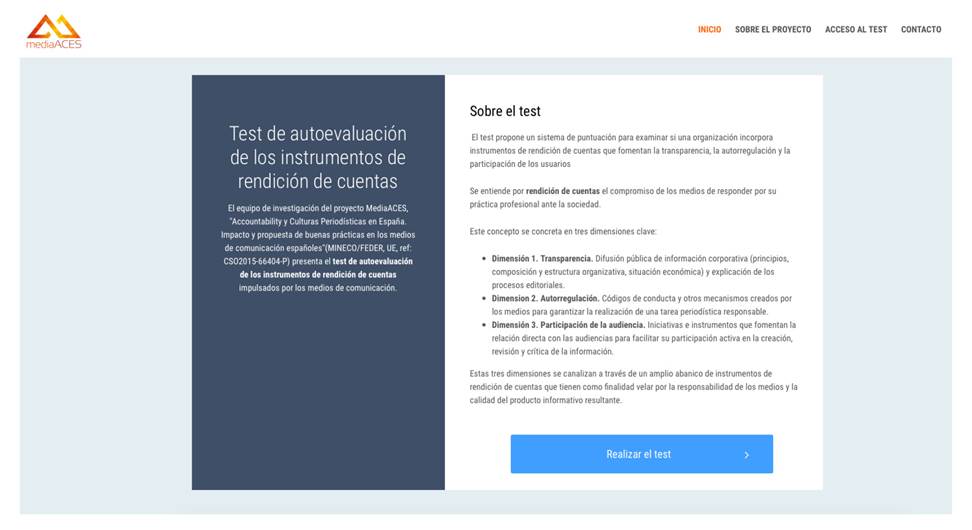 Partiendo de estos resultados y con el objetivo de incentivar la reflexión y la posterior toma de decisiones entre los profesionales, se ha diseñado una plataforma web de acceso abierto (http:// mediaaccountability.upf.edu) que permite a los medios evaluar si disponen y emplean dichos ins trumentos. Dicha plataforma plantea varias preguntas y propone un sistema de puntuación sobre 15 puntos para determinar si un medio presenta una escasa orientación a la rendición de cuentas (0-5 puntos), favorece la rendición de cuentas (6-10 puntos) o fomenta activamente la rendición de cuentas (11-15 puntos). Esta herramienta open access puede ayudar a la introducción o rediseño de instrumentos de accountability en aras de mejorar la transparencia, autorregulación y participación de los usuarios.