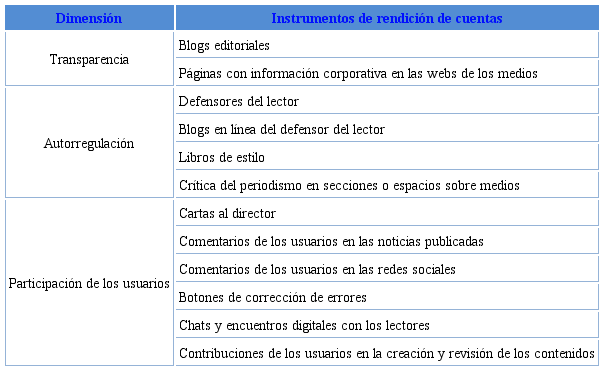 Los instrumentos de rendición de cuentas han experimentado una evolución dramática en el entorno digital (Fengler et al., 2014), que permite nuevas formas de fomentar la transparencia, la autorre gulación y la supervisión de la calidad informativa en que la participación activa de los usuarios (Eberwein et al., 2011) juega un papel decisivo. En este nuevo escenario, los medios han adaptado sus instrumentos internos y han creado nuevos mecanismos online, como los blogs editoriales que ahondan en los procesos productivos (Spiller et al., 2016), páginas de Facebook en que “los editores y periodistas explican a los lectores sobre su trabajo” (Bjerke, 2018, p. 184) y otros mecanismos de transparencia corporativa (Campos-Domínguez y Redondo-García, 2015). Como Fengler et al. (2014, p. 272) señalan, estas prácticas “pueden cultivar un conocimiento más profundo de los me dios entre el público”, contribuyendo así a “cultivar la educación mediática de la audiencia” (van der Wurff y Schönbach, 2014, p. 123) (Tabla 1).
