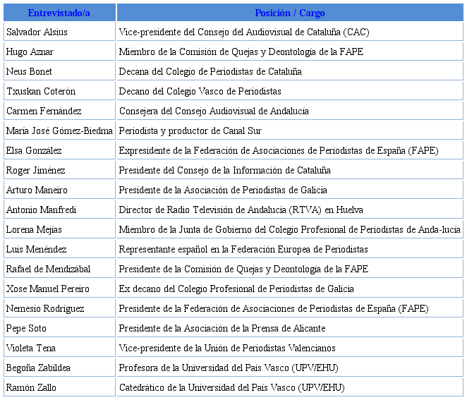 Finalmente, para reforzar y contrastar los datos obtenidos a través de las técnicas mencionadas, se llevaron a cabo 19 entrevistas en profundidad (King, 2010) con expertos y miembros de entes de autorregulación y asociaciones profesionales en España. Los entrevistados se seleccionaron en base a criterios estratégicos como su relevancia, experiencia y conocimiento de la ética periodística en el escenario español. Las entrevistas presenciales se realizaron entre abril y junio de 2018, siendo grabadas en audio para su transcripción posterior. Los extractos seleccionados ofrecen matices que complementan las visiones de los periodistas y ciudadanos, facilitando la discusión de los resulta dos obtenidos (Tabla 2).