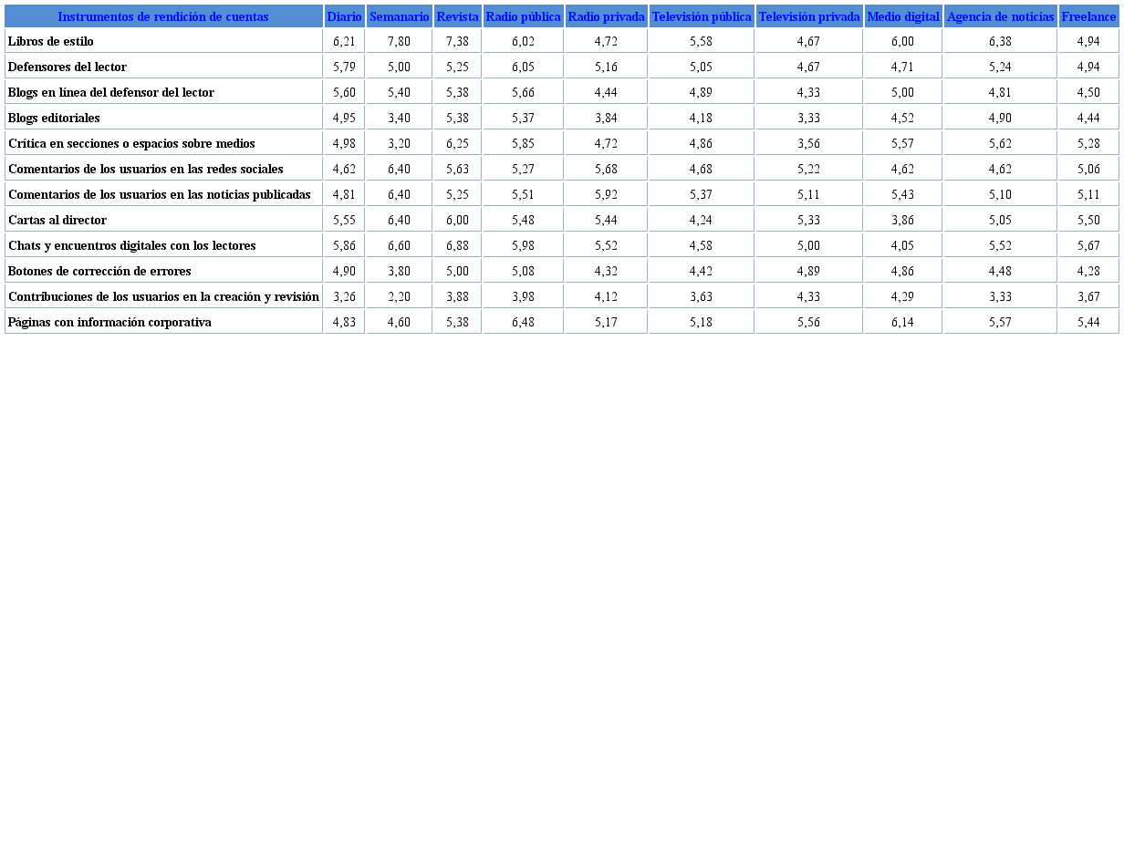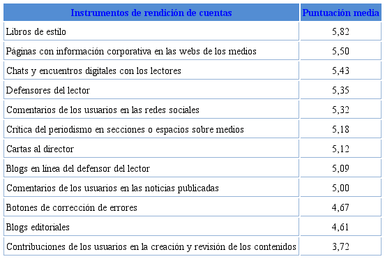 En un estudio pionero, Fengler et al. (2014) realizaron una encuesta comparativa con 1762 periodis tas de 14 países diferentes (Alemania, Austria, España, Estonia, Finlandia, Francia, Holanda, Italia, Jordania, Polonia, Reino Unido, Rumanía, Suiza y Túnez) para descubrir las percepciones de los profesionales sobre los instrumentos de rendición de cuentas. El proyecto Media Accountability and Transparency in Europe (MediaAcT) reveló que los periodistas europeos consideran a los libros de estilo como los instrumentos tradicionales creados por los medios de comunicación que tienen la mayor influencia en su práctica profesional (3,74 sobre 5 puntos), seguidos de la crítica mediática (2,73) y los defensores del lector (2,32). En referencia a los instrumentos innovadores, los perio distas europeos valoraron a los comentarios de los usuarios (2,84) por encima de la crítica en redes sociales (2,61) y los blogs editoriales (2,28).