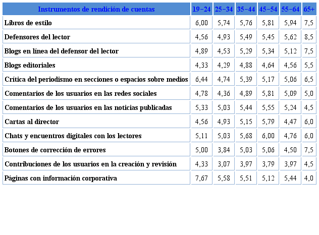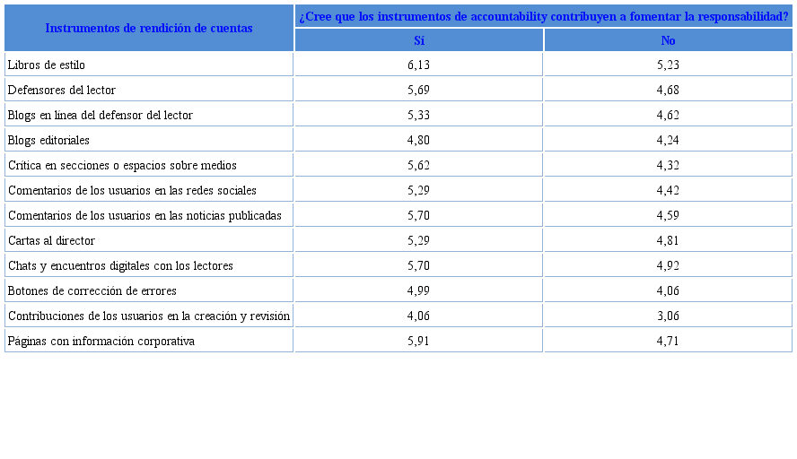 Otro instrumento que aprueba en valoración de eficacia, con un 5,35, es el defensor del lector o de la au diencia, un mecanismo que también cuenta con un una larga tradición y arraigo en los medios españoles. Estas características también son compartidas con las cartas al director, que obtienen un 5,12 de valora ción. Los blogs de los defensores del lector también superan el aprobado, aunque de forma muy ajustada (5,09). Finalmente, entre otros instrumentos de accountability, la crítica del periodismo en las secciones de comunicación y medios registra una puntuación de 5,18. En contraste, los blogs editoriales no llegan al aprobado (4,61). Este resultado es similar al obtenido por los botones de corrección de errores (4,67) (Tablas 3 y 4).