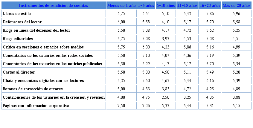 En otros cuatro instrumentos más vemos como los años de experiencia laboral influyen en la valo ración. Así, los periodistas encuestados con menos de 1 año valoran el libro de estilo con un 6,75 mientras que los de más de 20 años de experiencia le dan un 5,96 de media. Un patrón similar se puede observar con el defensor del lector, valorado con un 6 por los de menos de 1 año y con un 5,5 por los de más de 20 años, pasando por un 4,10 por los que llevan entre 6 y 10 años). Los blogs del defensor del lector se puntúan con un 6,50 de media entre los que tienen menos experiencia, dato que contrasta con el 5,25 entre los más veteranos. De forma similar, esta correlación también se observa en los blogs editoriales: se valoran con un 5,75 entre los periodistas encuestados que hace menos de 1 año que ejercen, pero esta puntuación cae al 4,51 entre los que llevan más de 20 años trabajando.